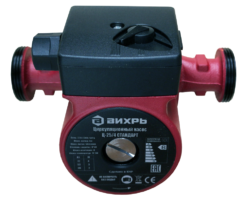 В названии циркуляционных насосов Вихрь отражены два параметра, например: Ц-25/4. Первые две цифры — это диаметр присоединительных патрубков. В нашем случае 25 мм (1 дюйм) — диаметр резьбы гаек, поставляемых в комплекте с циркуляционным насосом. Он должен соответствовать диаметру труб (переходников) в системе отопления. В системах отопления наиболее распространены два диаметра — 25 и 32 мм. Второе число обозначает максимальный напор насоса. В нашем примере максимальный напор составляем 4 м, то есть он может создавать избыточное давление до 0,4 атм. Этот параметр должен превышать расчетный напор требуемый для системы отопления. Пример упрощенного расчета требуемого напора будет приведен ниже. Потребляемая мощность циркуляционных насосов регулируется ступенчато (3 положения). Мощность и максимальный напор для каждой ступени указан в таблице на корпусе насоса. Кабель питания подключается к клеммной колодке и в комплект не входит.